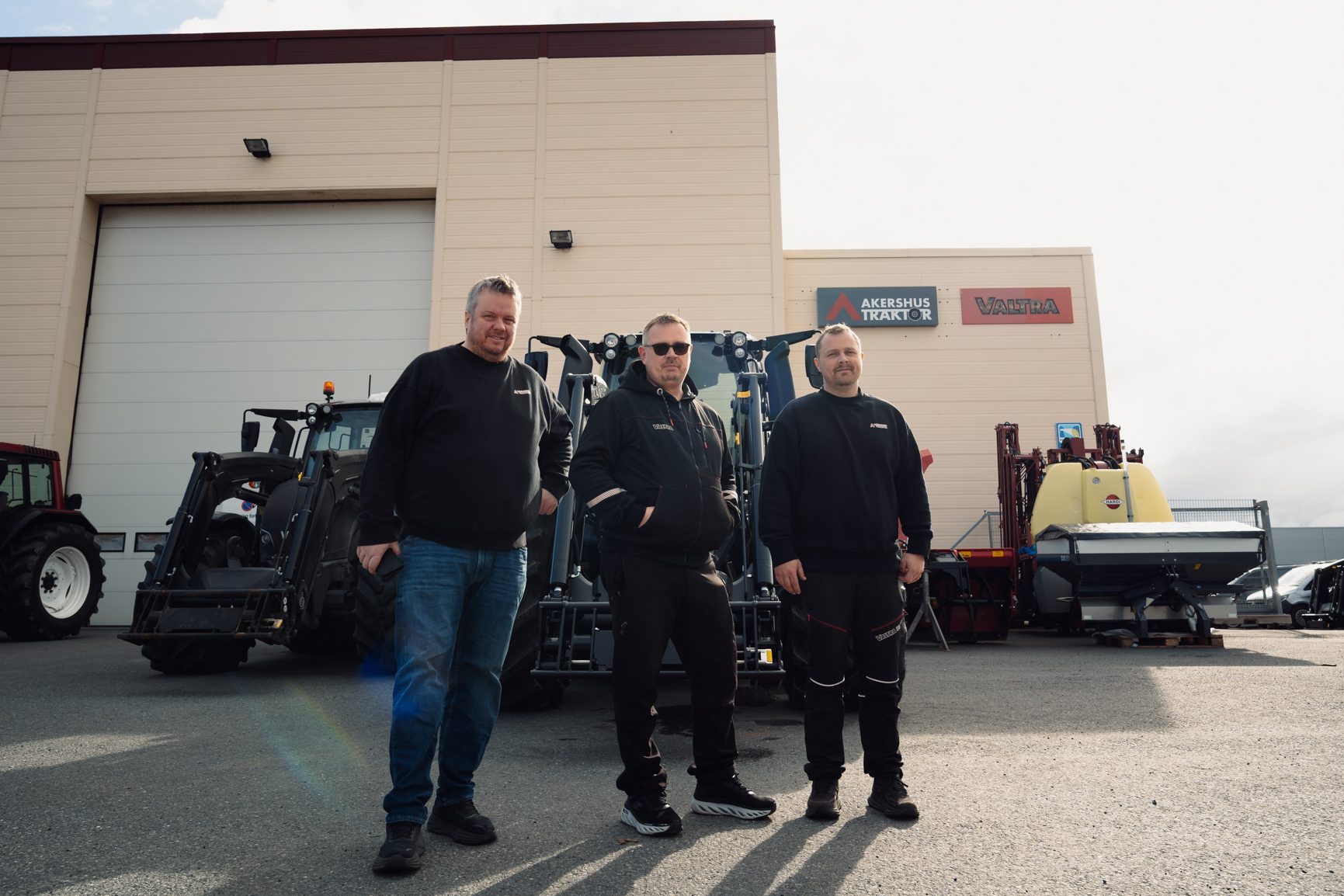 PÅ PLASS: Akershus Traktor Verdal tar med grasmaskiner fra Pöttinger og Kuhn, i tillegg til Valtra traktorer, på Grasdemo. F.v: Frode Moe, Svein Erik Nordmark og Espen Thiedemann.