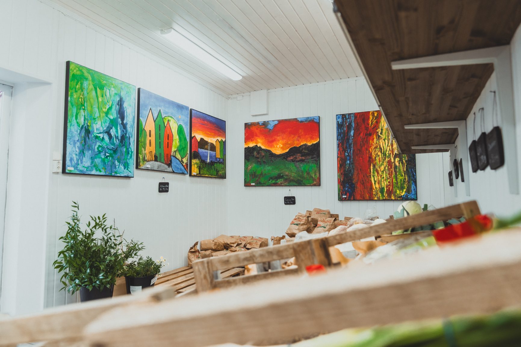 På veggene i kjølerommet henger det også kunst – fargerike og uttrykksfulle malerier signert Per Vatn, en lokal kunstner.