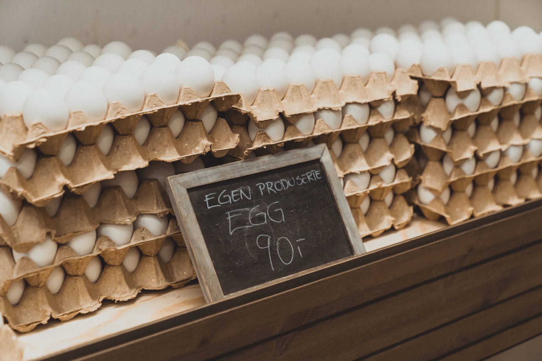 Med 7500 høner i hønseriet like ved, bugner det også av ferske egg i disken.