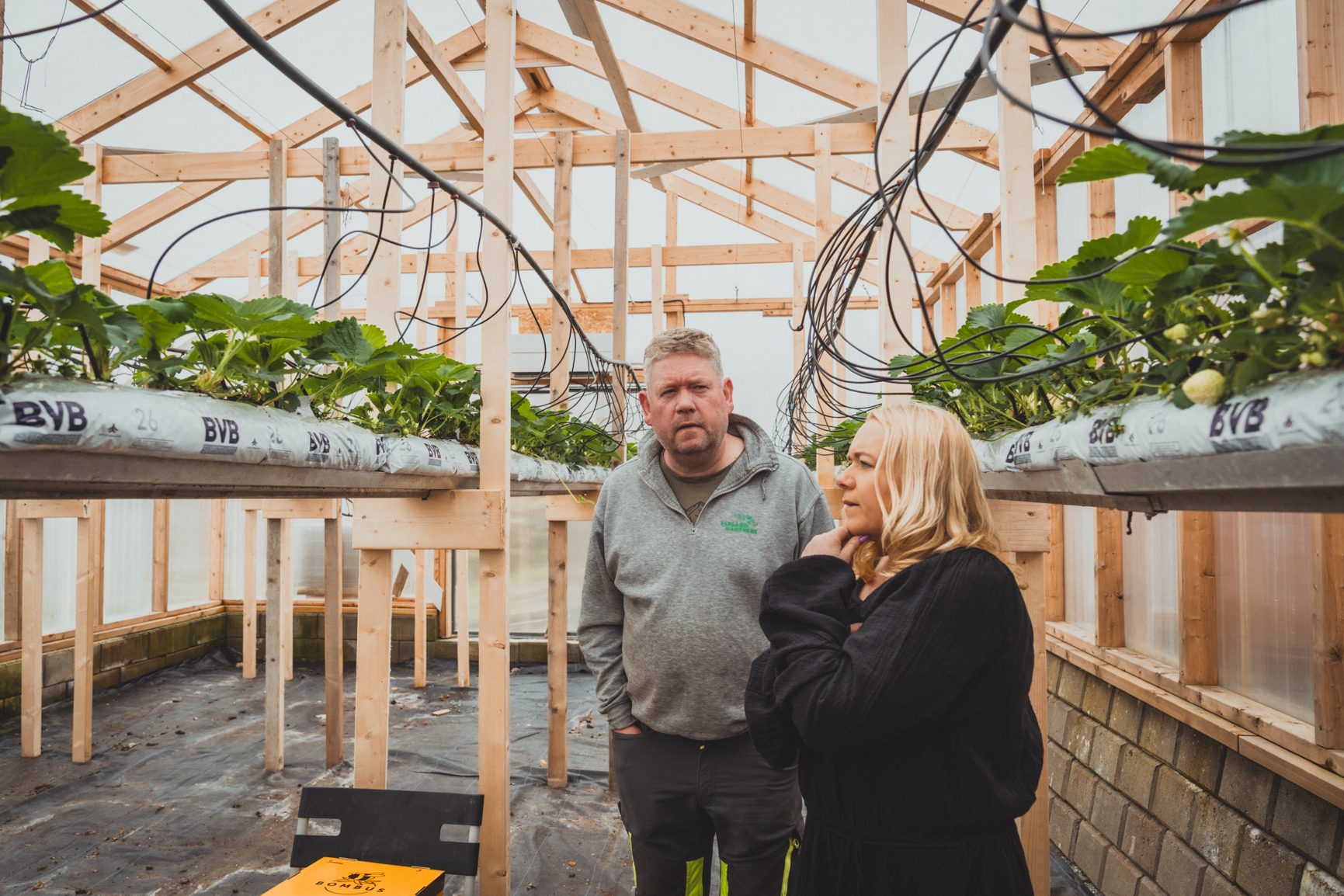 JORDBÆRHUS: I de nyeste drivhuset tester Bjørn og Cecilie ut produksjon av jordbær av typen Favori.